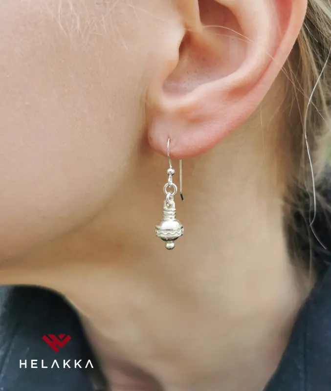 - Kierrätyshopeasta, eli vanhoista hopealusikoista valmistetut korvakorut. Leimattu Helakka