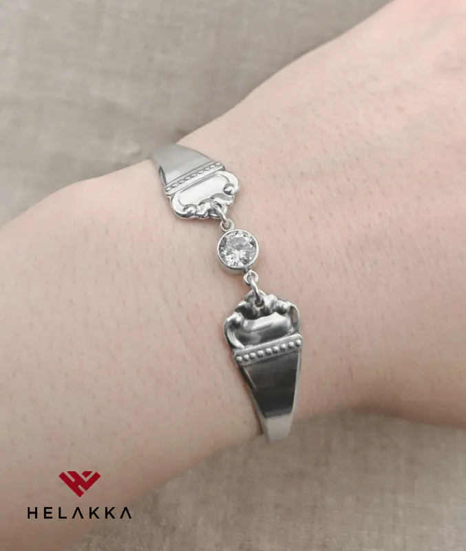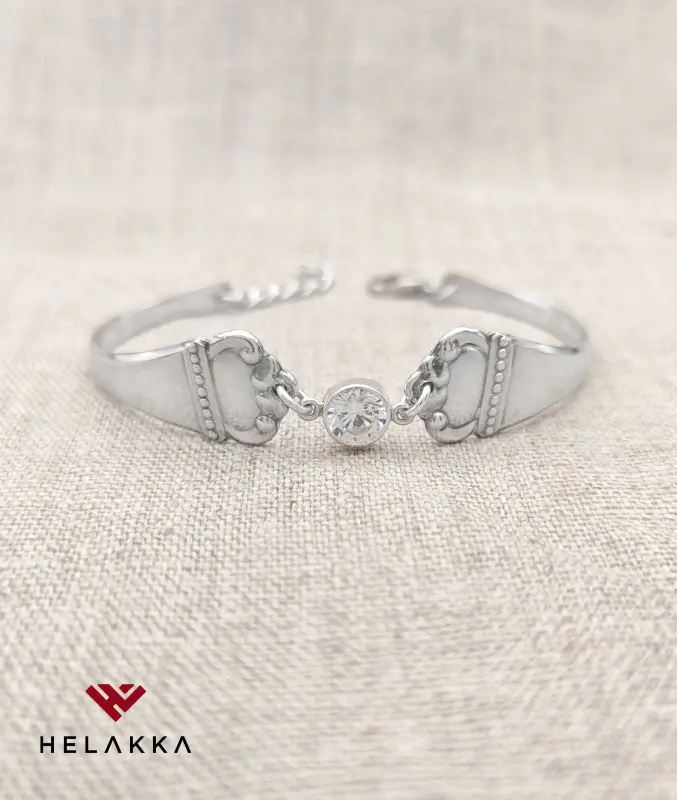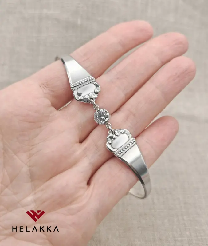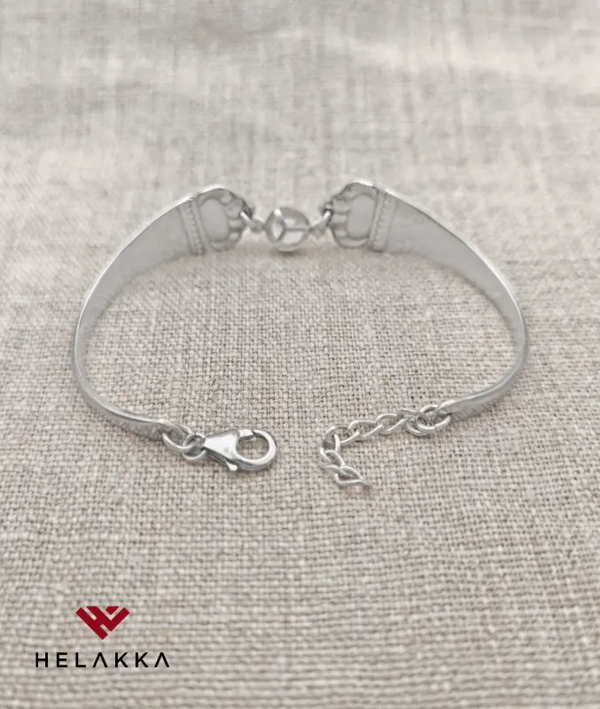 - Kierrätyshopeasta, eli vanhoista hopealusikoista, valmistettu hopeinen rannekoru. Leimattu Helakka