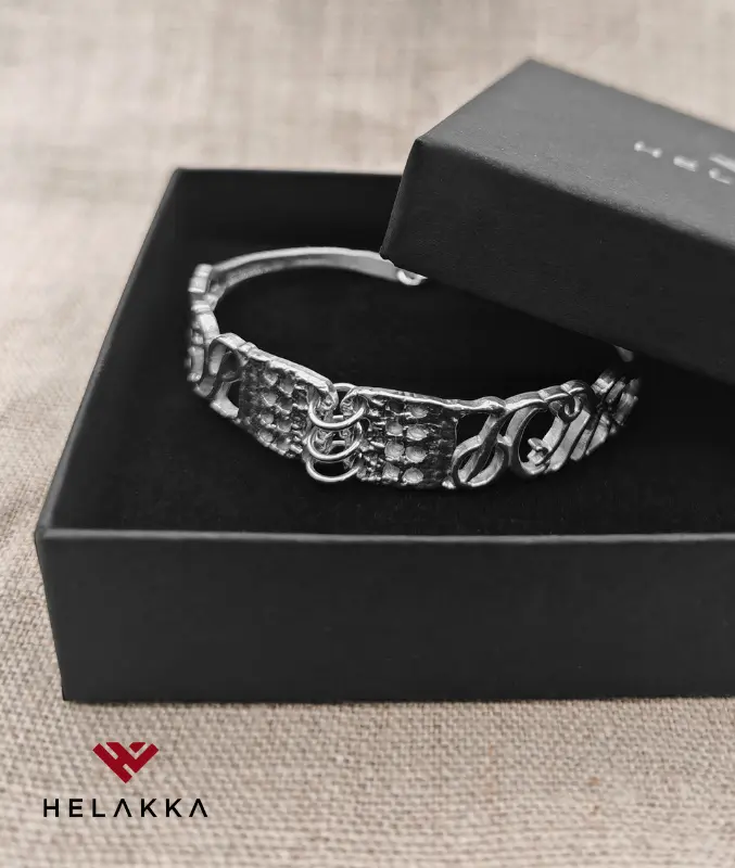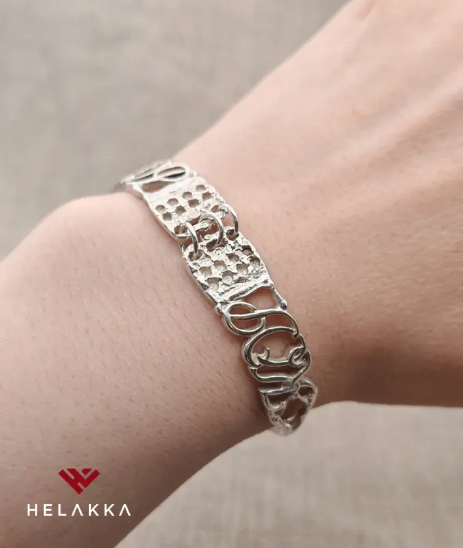 - Kierrätyshopeasta, eli vanhasta hopealusikasta, valmistettu hopeinen rannekoru. Leimattu Helakka