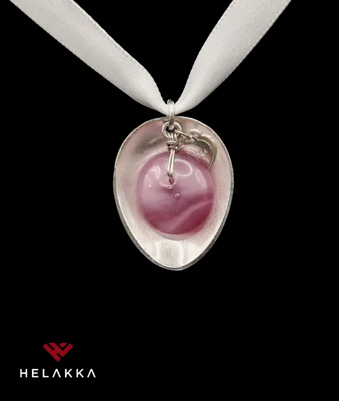 - Vanhasta hopealusikasta, hopeasta ja sulatuslasista valmistettu riipus. Leimattu Helakka