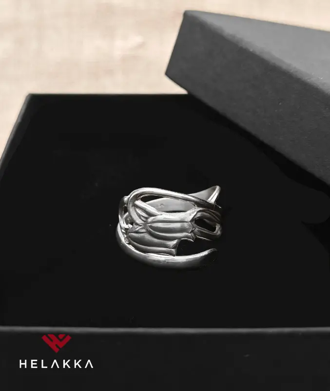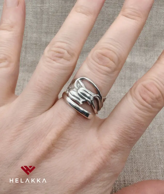 - Kierrätyshopeasta, eli vanhasta hopealusikasta valmistettu sormus. Leimattu Helakka